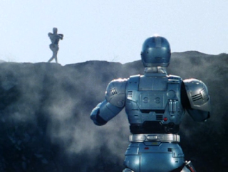 Jiban e usa o seu "Maximillian gun" para atirar na Mad Garbo. ela usa o escudo para defender o tiro.