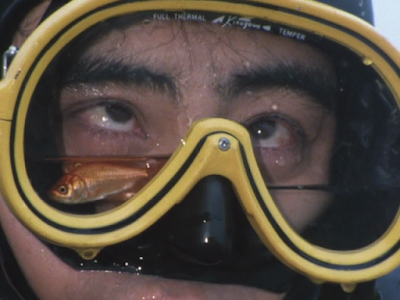 Animais aquáticos(ou, Animais marinhos) como Peixes-dourados nesse aquário grande. Daigorô está usando um Microfone subaquático para comunicar com os Peixes.