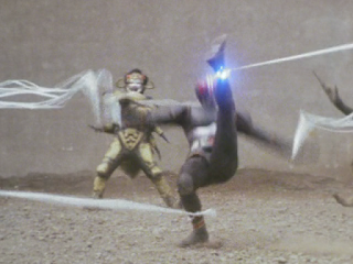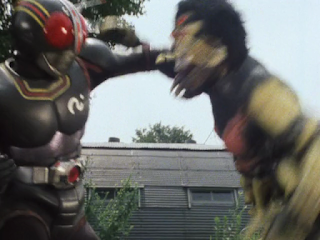 Aí vem os Monstros mutantes - Aranhas para atacar o Isamu e Pai dele. Um dos Monstros leva o Professor Akizuki e prende na Torre. Um Monstro soltou ele para cair, Isamu salvou ele. Mas, o Akizuki acabou morrendo por Monstros Aranhas. O Isamu com Ódio dele e vingando a Morte do Pai adotivo, se transforma em Kamen rider Black. Lutando contra eles. Com poder ele derrota os Monstros mutantes - Aranhas. "Lute... Kamen rider Black!!".