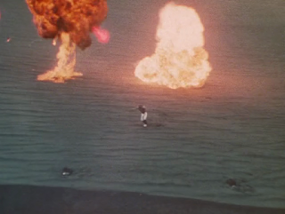 Quando o Monstro Marigoss gosta uma Esfera de fogo pela boca. Ameaçando o Jaspion no Deserto, vocês estão vendo as Bombas enterradas??